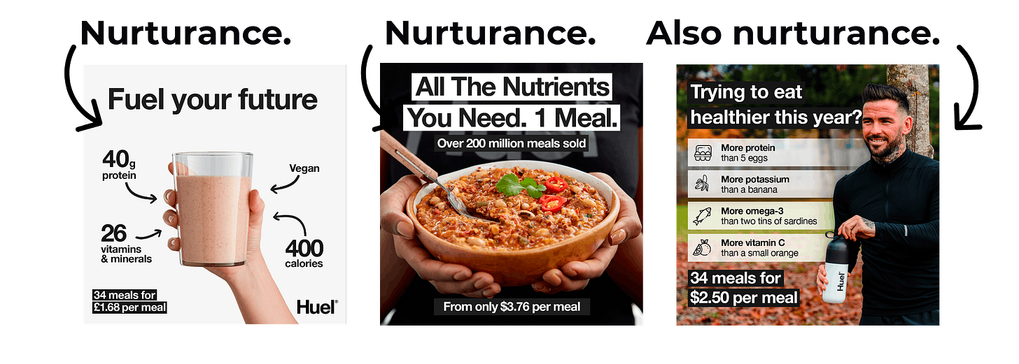 Huel has mastered the art of diversifying their emotional messaging within the 'Nurturance' framework. They have a message that resonates with different customer personas: